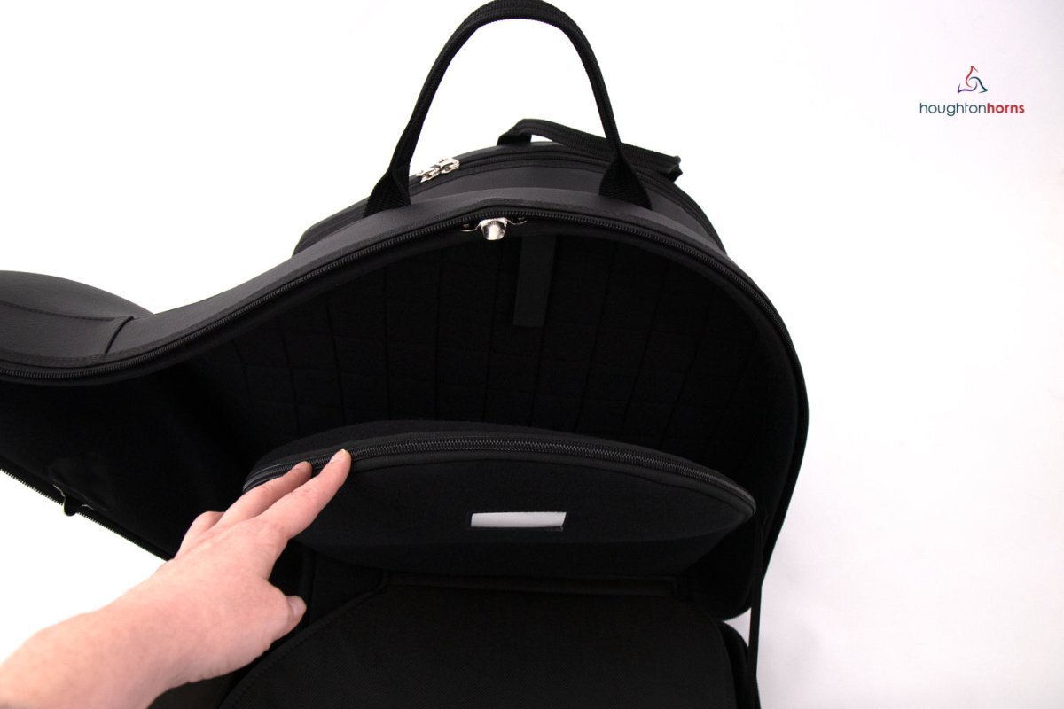 The main case fits a natural horn body and some crooks. The remaining crooks can be stowed in the detachable side case. Each crook fits into one of the variously sized pouches.