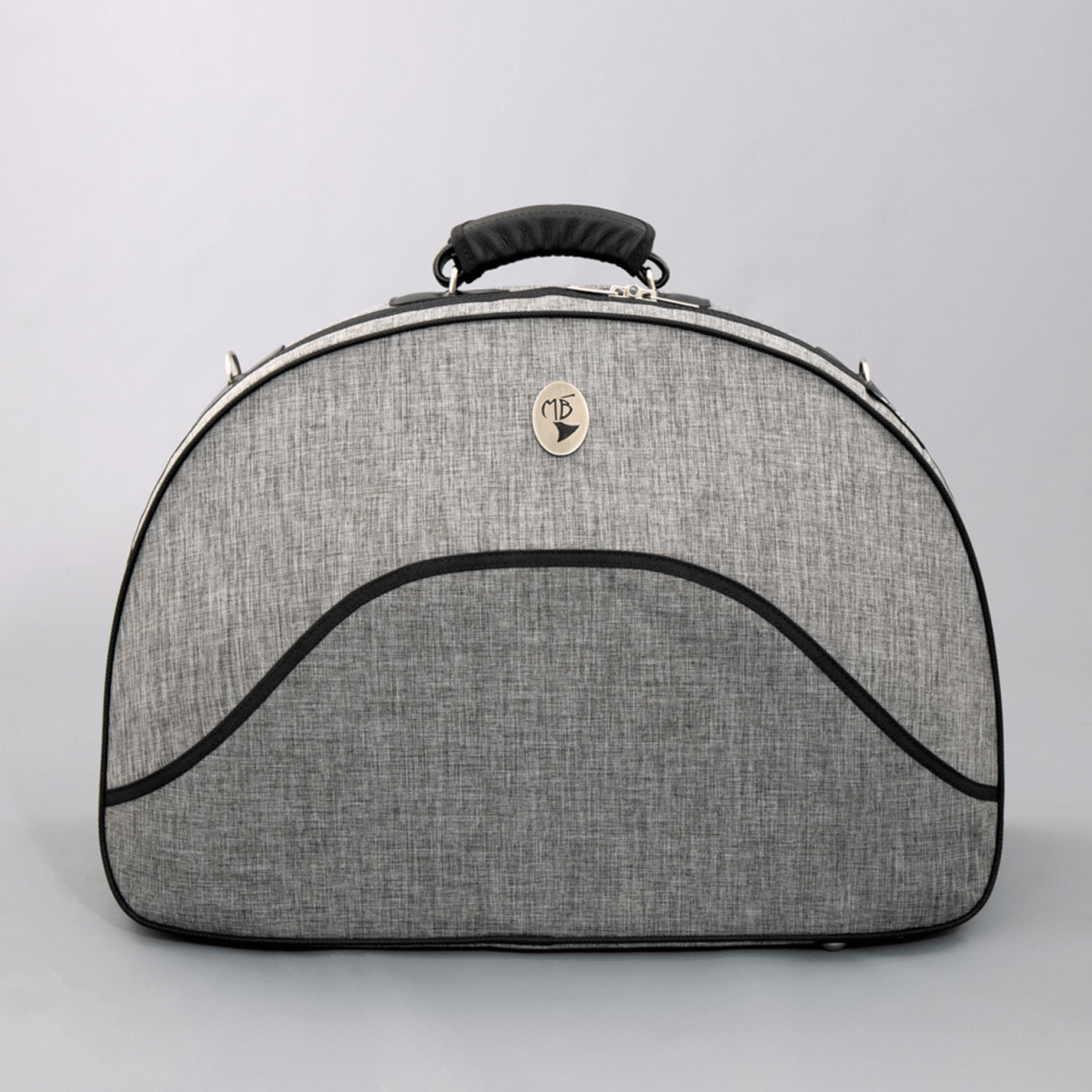 The bell is positioned on top of the French horn body, inside a foam bell protector. A velcro belt keeps the instrument's body fixed and secured. Accessories can be stored inside the designated compartment.