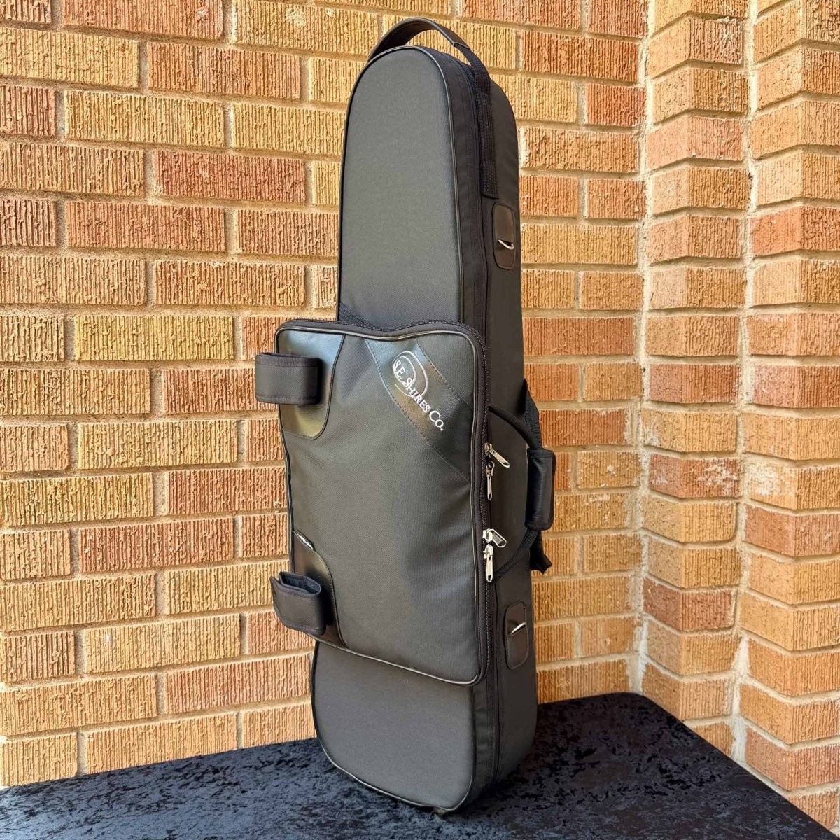 A Marcus Bonna tenor trombone case with the S.E. Shires Co. logo embroidered on the front accessories pocket. They have never been purchased but have traveled to several shows with us.