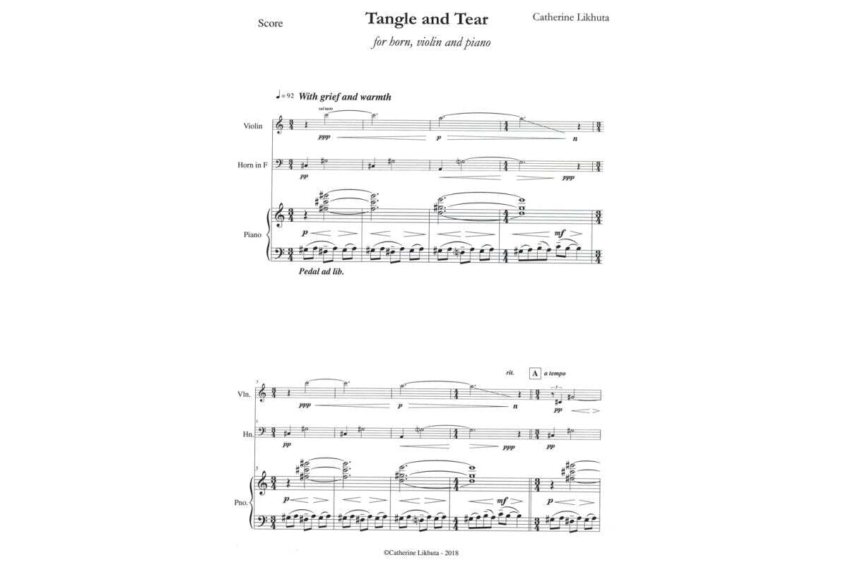 Tangle and Tear (2018) was originally written as a trio for violin, bass clarinet and piano, commissioned by Plexus (Melbourne, Australia), and later adapted for horn trio. Inspired by the amazing musicians in this ensemble and everything they do for Australian music, I wanted to use the concept behind the name Plexus as the base for the piece. One of the meanings of this word is “an intertwining combination of parts or elements in a structure or system [from Latin plectere–to braid]”. As I was looking into this definition, the word tangle kept coming to mind. Then, as I enjoy juxtaposing musical ideas and characters behind them, I thought of the opposite of “tangle”–“tear”. The concept of tangle and tear grasped me immediately, and my brain kept coming up with various ways in which this concept applies to our everyday lives. For me, it represents any situation that gets out of hand and cannot be untangled or resolved in a destruction-free way. It can be something light-hearted, like having to cut blue tack out of your pre-schooler’s hair (don’t ask me how I know this…); something devastating from within, like life-threatening addictions; finally, something dramatic and terrifying, like the only possible way out of an unhealthy and violent relationship. This last one kept churning in my head, influencing several sections of the piece, perhaps due to Australia’s out-of-control situation with domestic violence… The concept is also intentionally reflected in the form of the piece: unpredictable, with some sections taking a long time to tangle and some built around the struggle of tearing something irreparable apart. Musically, the entire piece is built on the opening’s emotional four-bar motif from the piano part.
