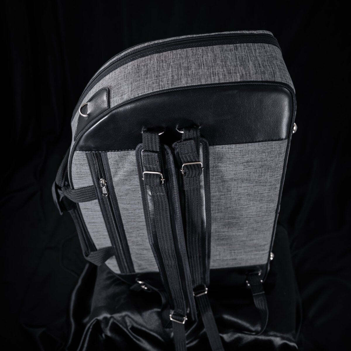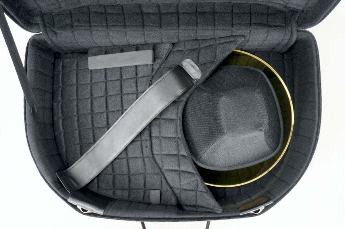 The bell is positioned below the French horn body, under a foam bell protector. A velcro belt keeps the instrument's body fixed and secured. Accessories can be stored inside the compartment below the corpus and in the exterior front sheet music bag.