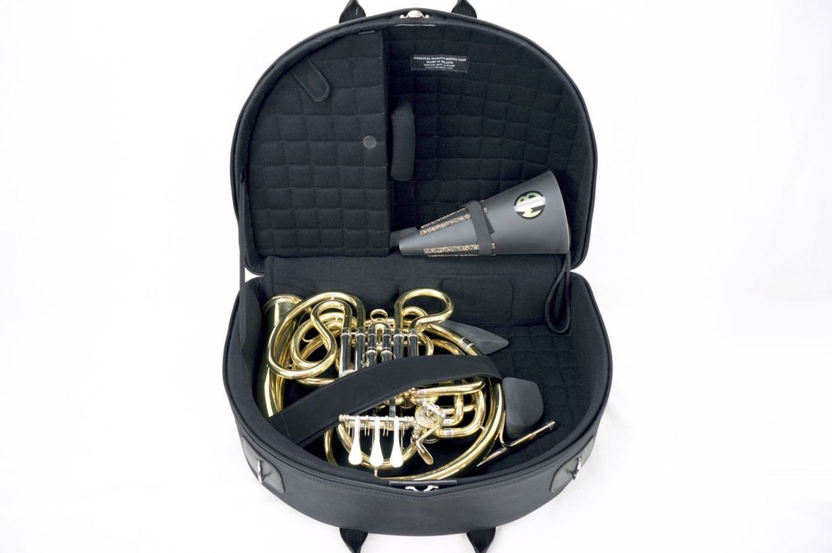This model holds a detachable bell French horn and one mute. The bell is positioned on top of the French horn body, inside a foam bell protector. A velcro belt keeps the instrument's body fixed and secured. Accessories can be stored inside the designated compartment.