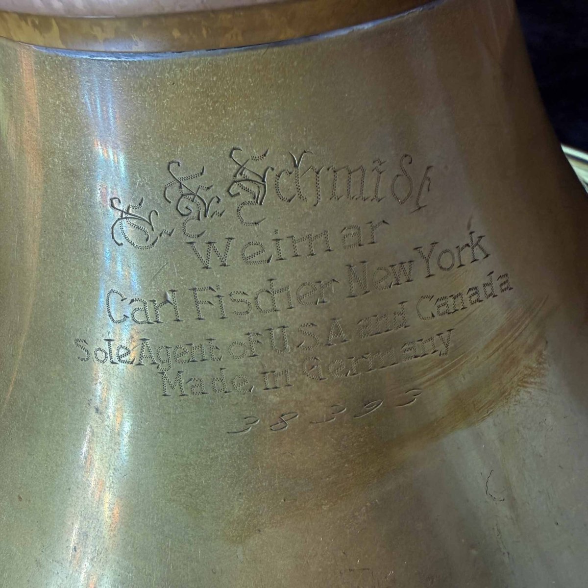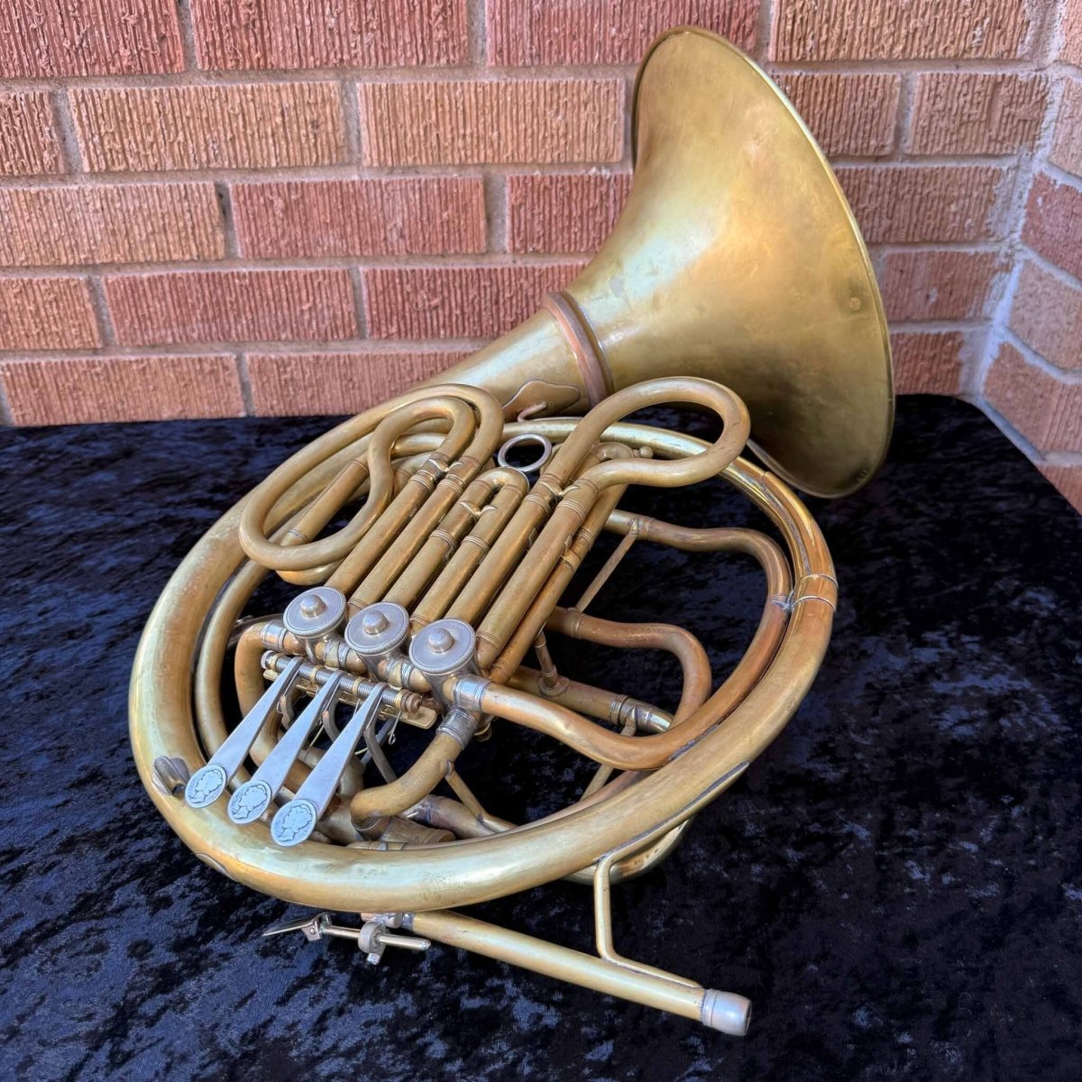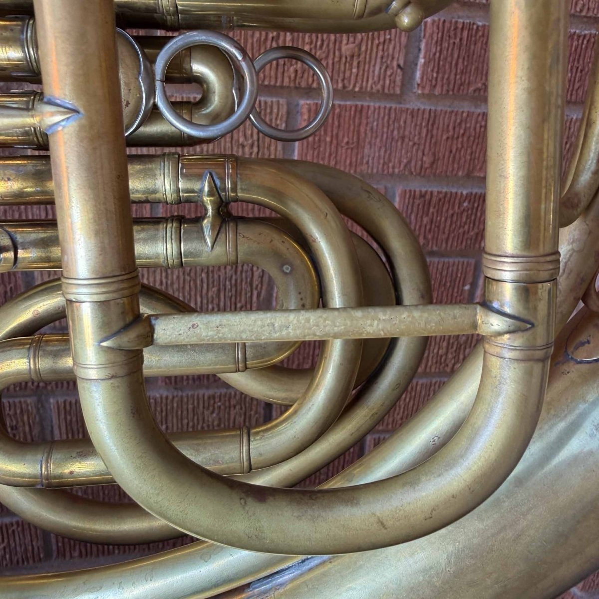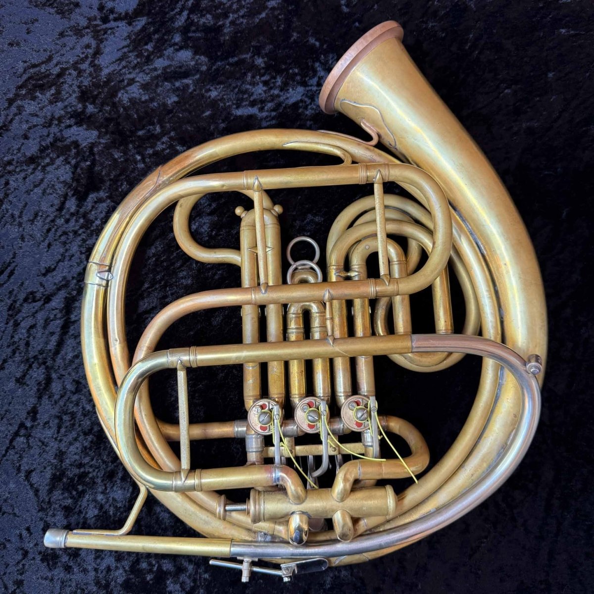 This horn has reached 100 years old, and plays very well for its age! It received a valve overhaul by Chris Reddick of Houghton Custom Horns, and the rotor compression is excellent for many more years of use. A new leadpipe was handmade to the original tapers, in nickel silver to prevent "red rot" or corrosion. The make life with the horn easier, a Durk flipper or "duck's foot" was installed, and the bell was converted to detachable with an Alexander threaded ring. The engraving is fully intact on the flare, and is still very crisp versus other examples. The instrument has not been buffed to preserve as much original metal as possible.