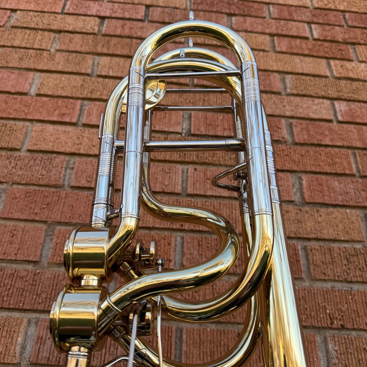 The THEIN Bass Trombone “Universal” model has been continuously developed together with Zachary Bond (Hong Kong Academy for Performing Arts) since 2010. Their idea was to combine the THEIN-Sound with the easy playability of the American trombone construction. This example has minor scratches on the bell, from Thein at a show, otherwise brand-new!