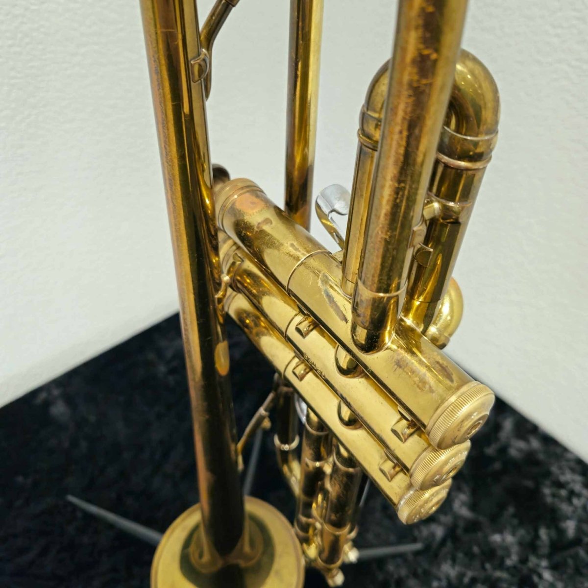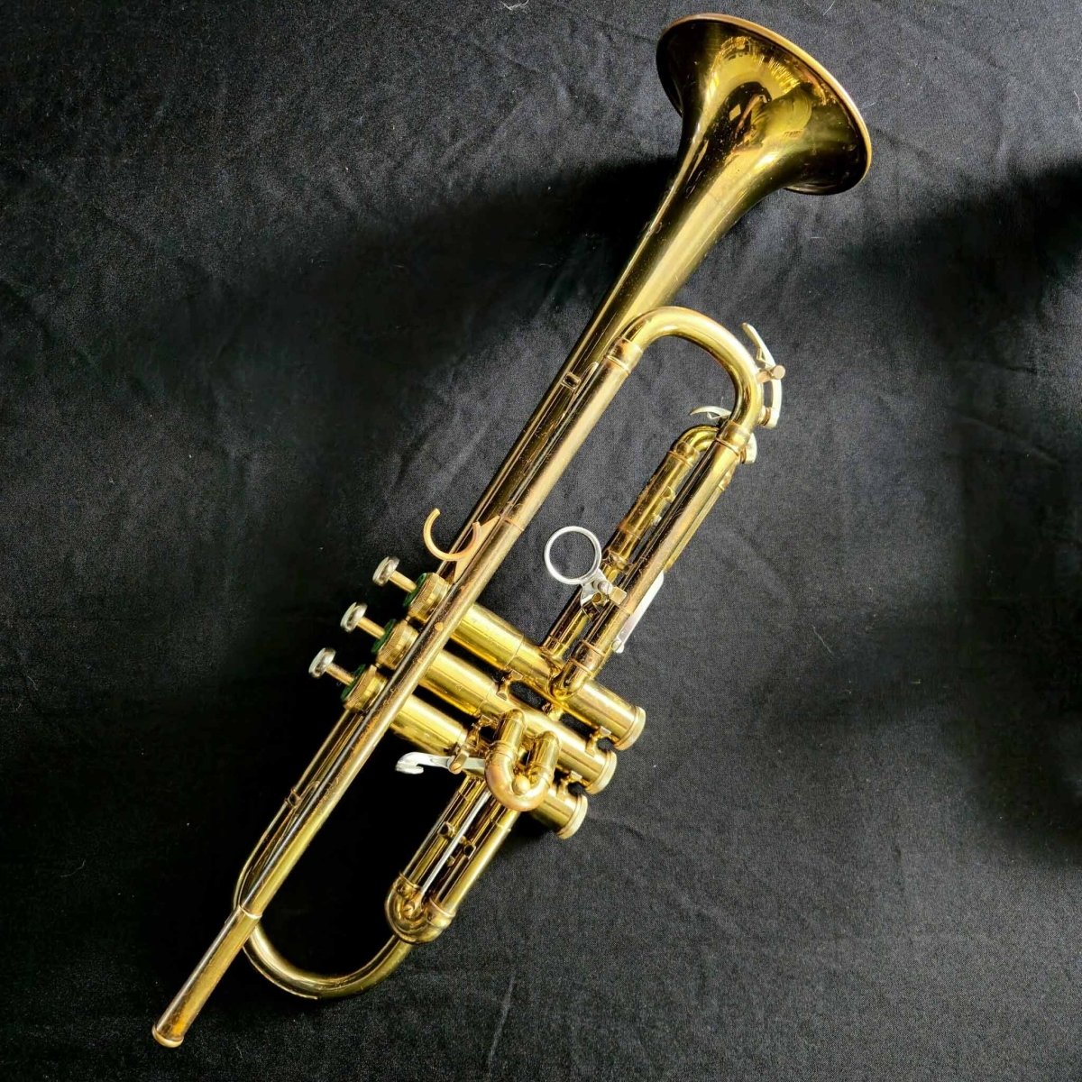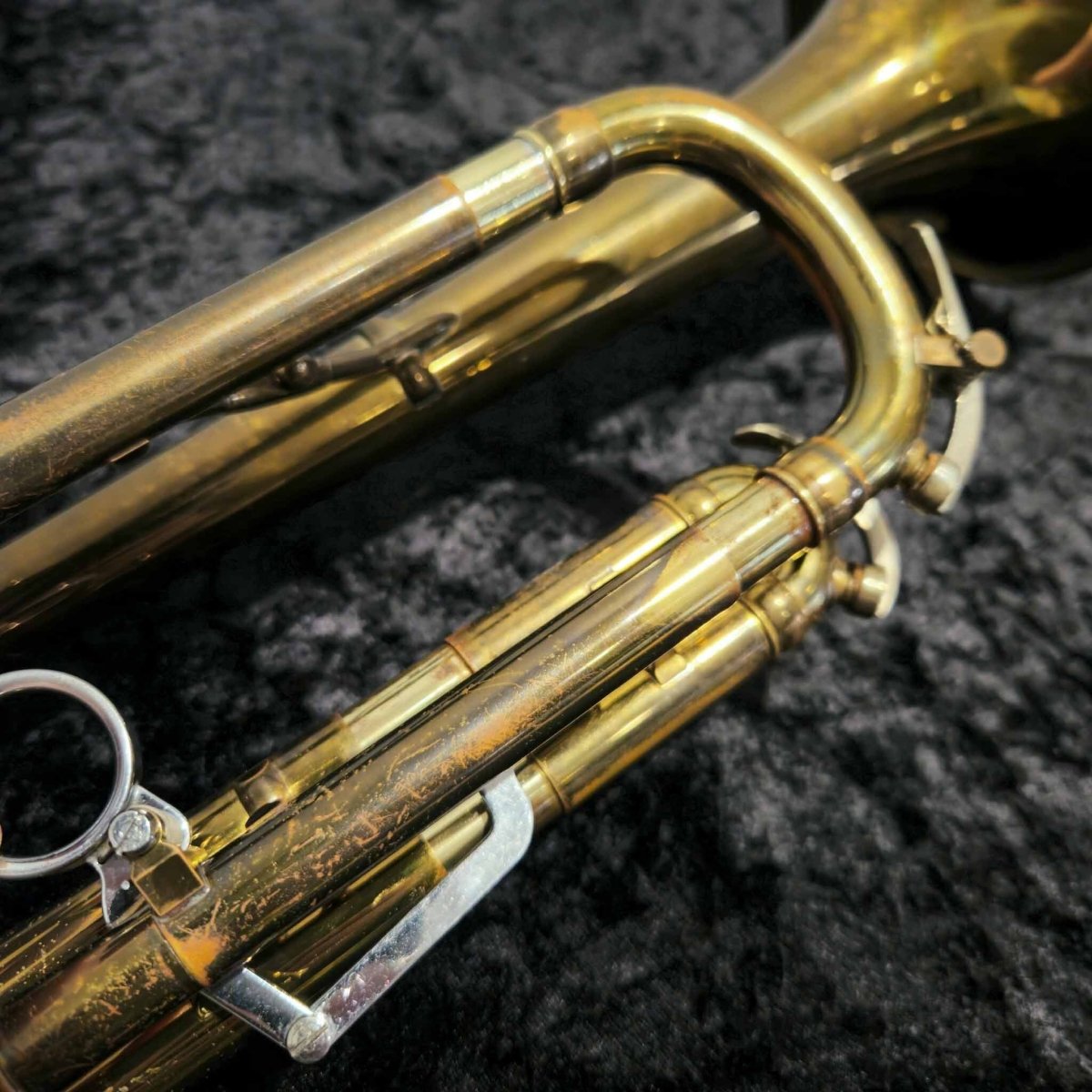 We received this trumpet from the original owner's family, with a stuck main tuning slide after years of storage, but preserved in great overall condition. The majority of its original lacquer is still intact, minus the bottom valve caps, and surface wear at contact points. The leadpipe was inspected and still seals with no leaks, its compression testing near a 0, and the valve compression is very good at around a 1.