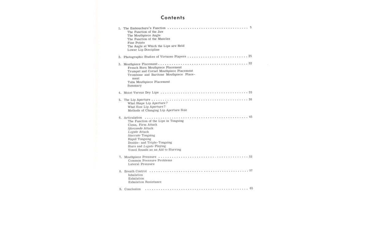 The Art of Brass Playing is a treatise on the formation and use of the brass player's embouchure. It includes sections on the embouchure's function, mouthpiece placement, moist versus dry lips, the lip aperture, articulation, mouthpiece pressure, and breath control. A must-have for all brass players, this includes photos of the embouchures of Adolph Herseth, Philip Farkas, Edward Kleinhammer, and Arnold Jacobs, among others. This book has become a standard in brass technique classes and at conservatories everywhere.