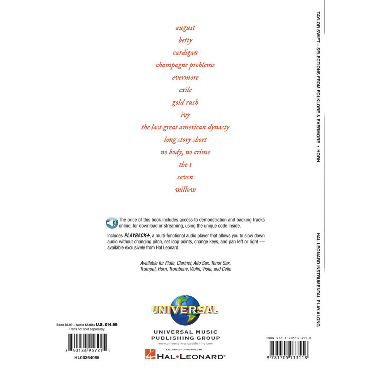 14 songs from the two 2020 album releases by the ever-popular and musically prolific Taylor Swift in arrangements for instrumentalists with approximately one year of playing experience. Each of these books also includes demonstration and play-along audio tracks online for download or streaming. Songs include: August • Cardigan • Exile • Gold Rush • Long Story Short • No Body, No Crime • Seven • Willow • and more.