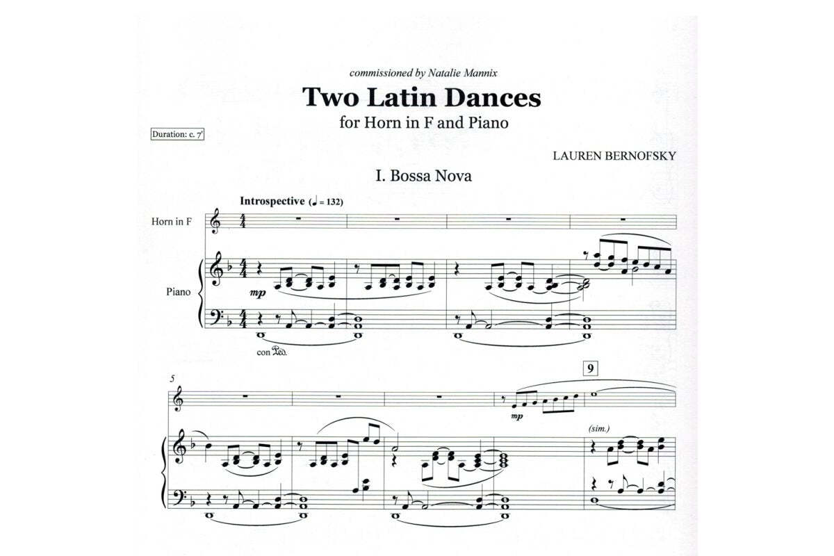 TWO LATIN DANCES is a beautifully evocative and sizzling work based on Bossa Nova and Tango rhythms, now available in a new arrangement for horn and piano by the composer. While at first sounding as two distinct movements, the characteristic dances gradually intertwine to create a uniquely integrated and ever-building whole. Celebrated trombonist Natalie Mannix commissioned the original work for trombone and piano, and introduced TWO LATIN DANCES at the 2016 International Trombone Festival. Mannix has recorded the work on her CD Breaking Ground: A Celebration of Women Composers. For advanced performers.