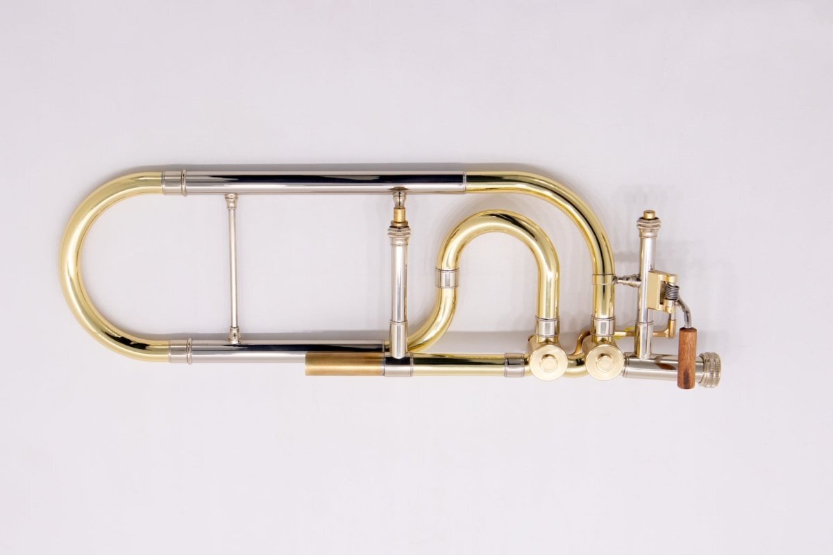 Bass trombone double valve sets can be ordered with either independent (inline) or dependent (stacked) valve configuration: