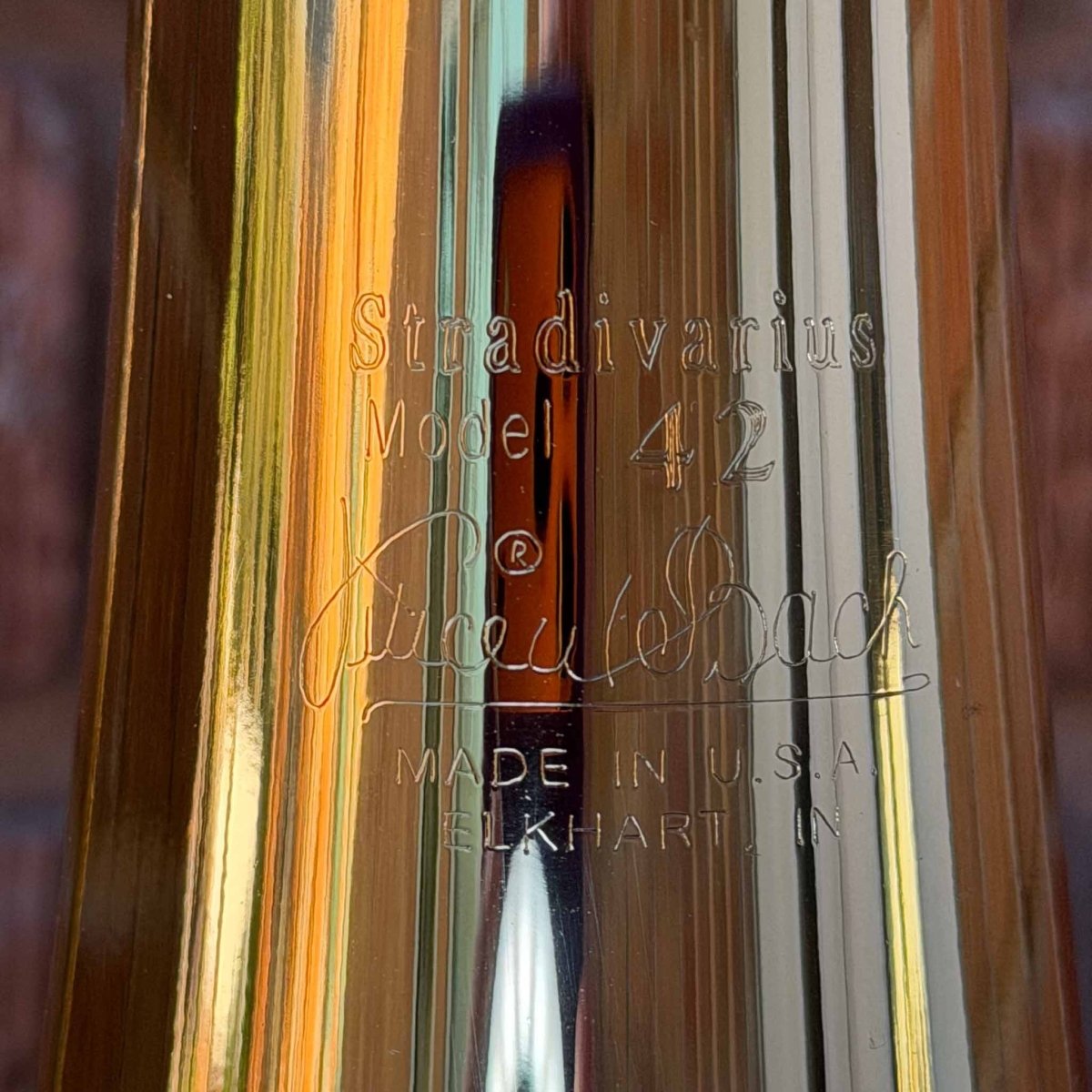 This Bach Strad 42BO is in great shape, and is fresh from a shop ultrasonic cleaning and maintenance! The majority of the lacquer remains, with only minor surface wear and a well-repaired bell crease, and the rotor and hand-slide are within new tolerances (1 and 0.8 compression). Includes the original case is in great working shape.