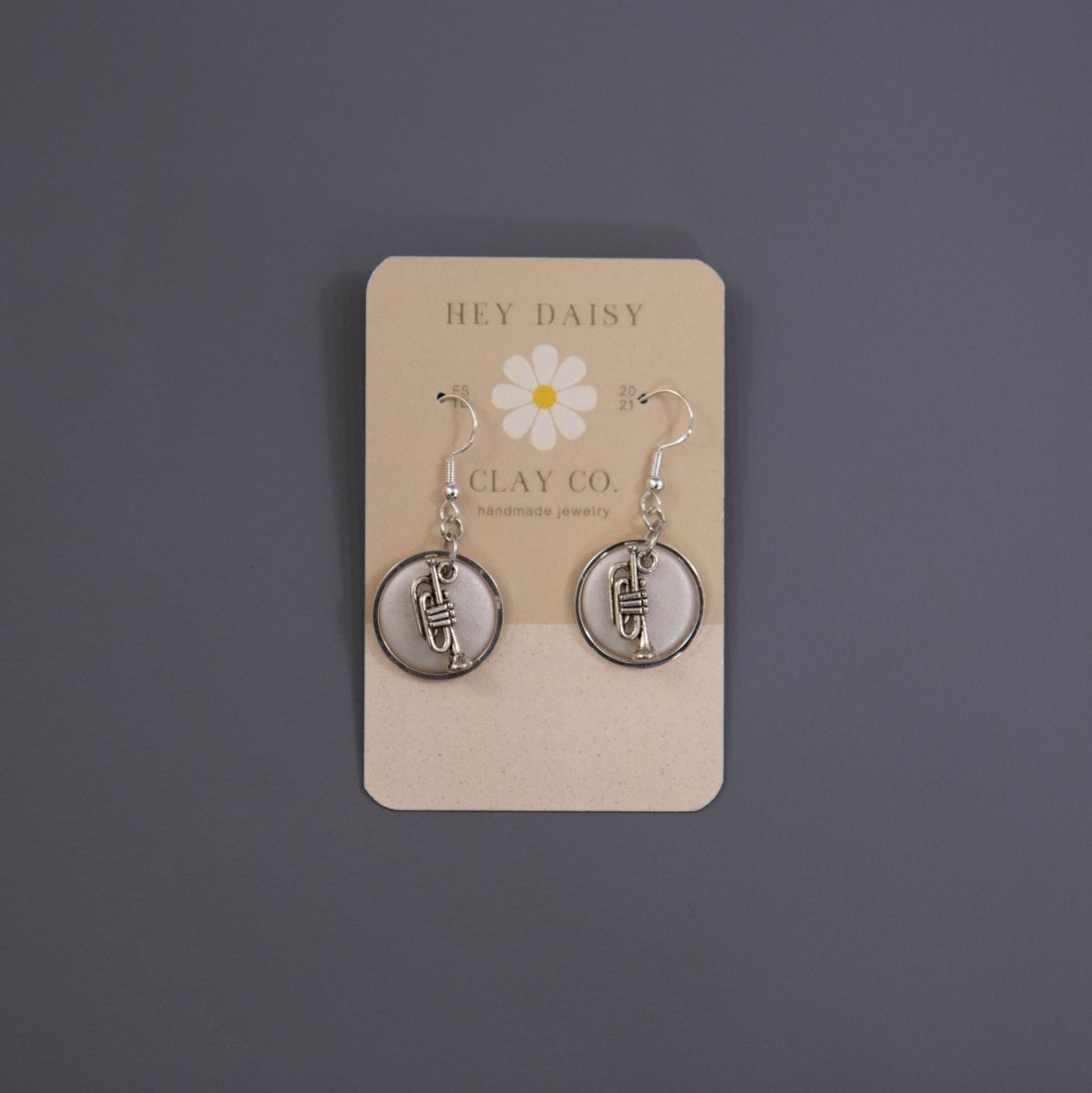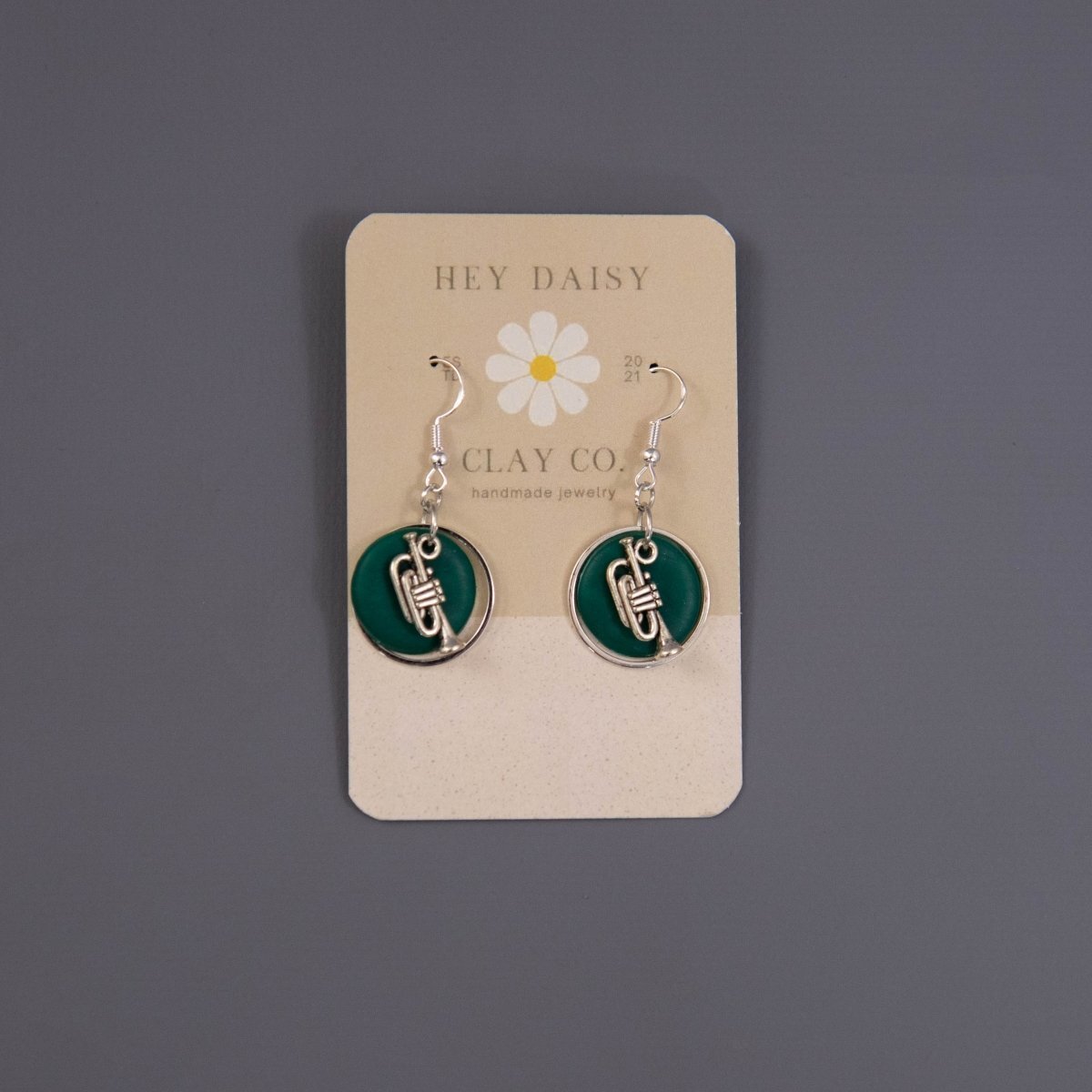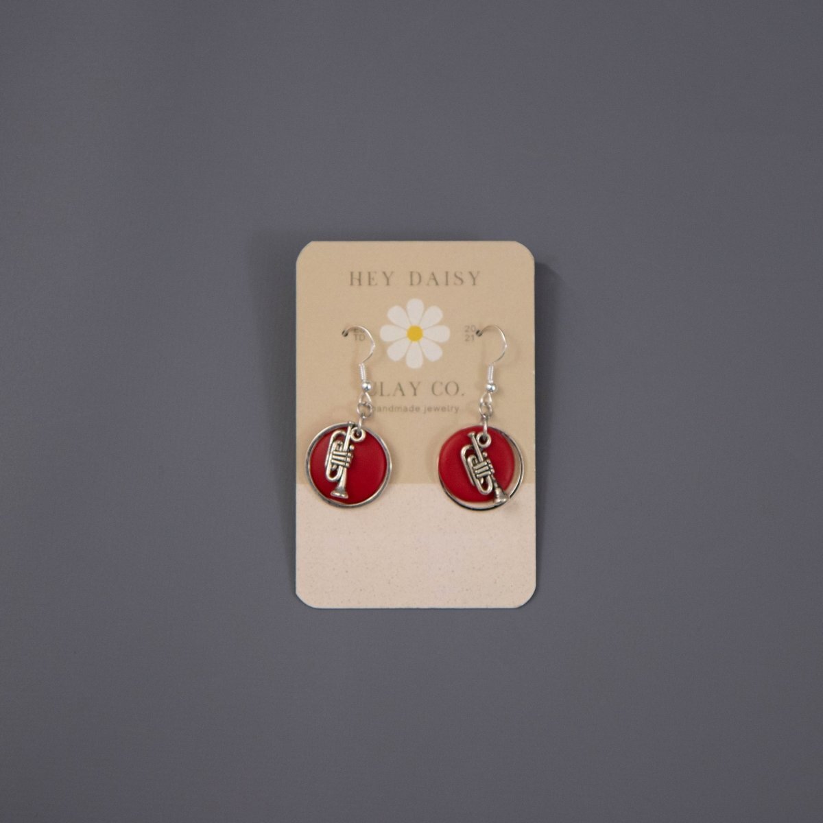 Hand-made musical instrument earrings from Hey Daisy Clay Co. If the option you desire is showing as out of stock, it can be custom-made for you within 10 business days. Just go ahead and purchase and we'll ship the earrings when they're done!