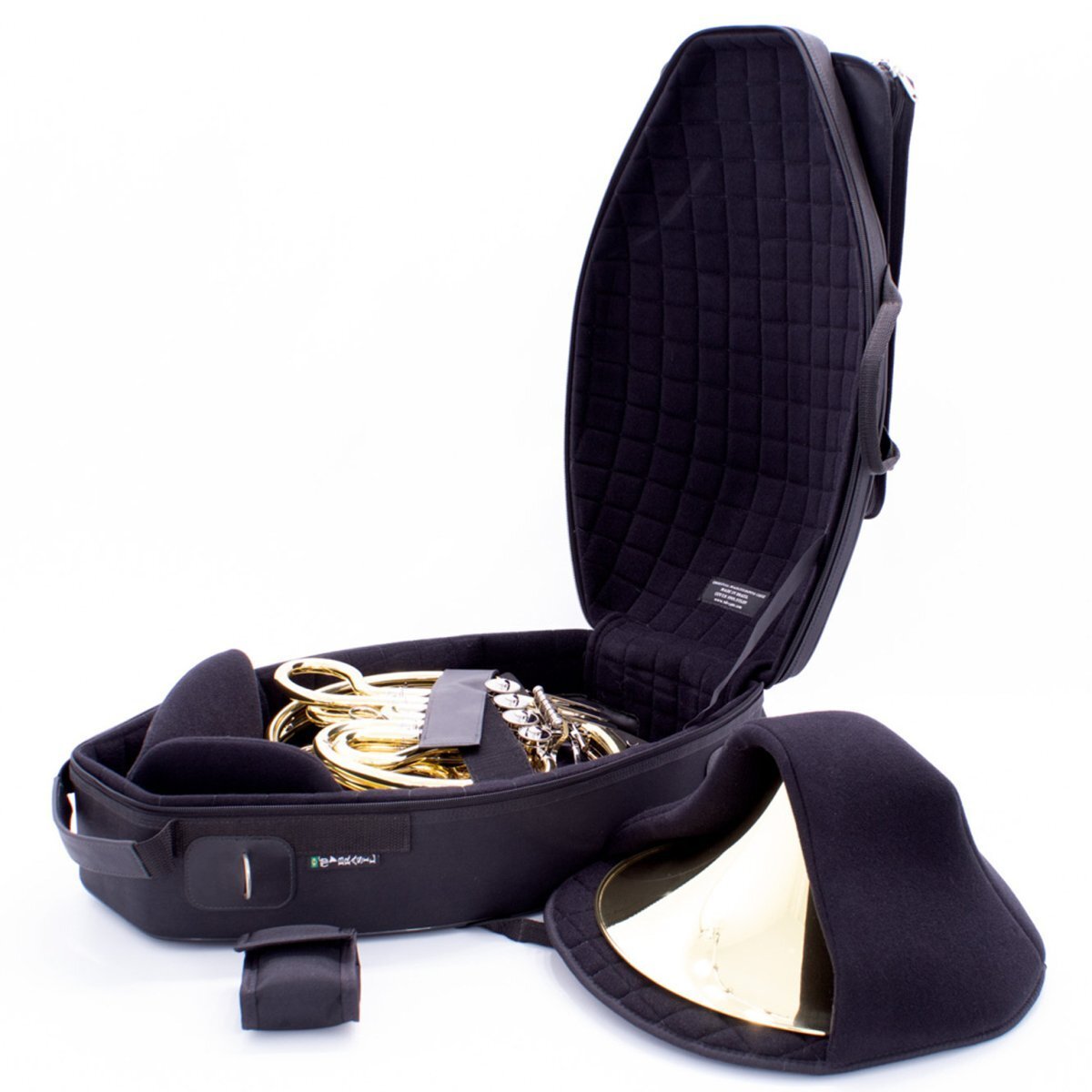 The bell is positioned on top of the French horn body, inside a foam bell protector. A velcro belt keeps the instrument's body fixed and secured. Accessories can be stored inside the case and in the exterior sheet music bag.