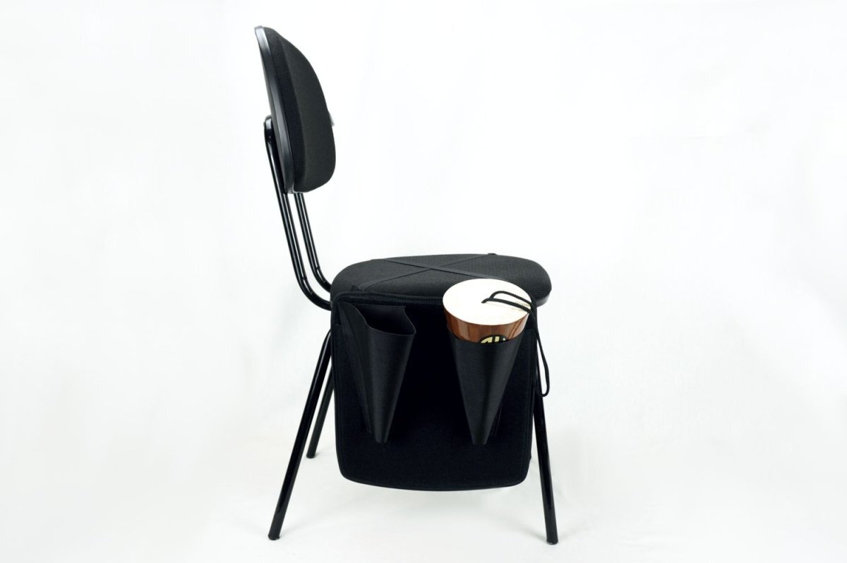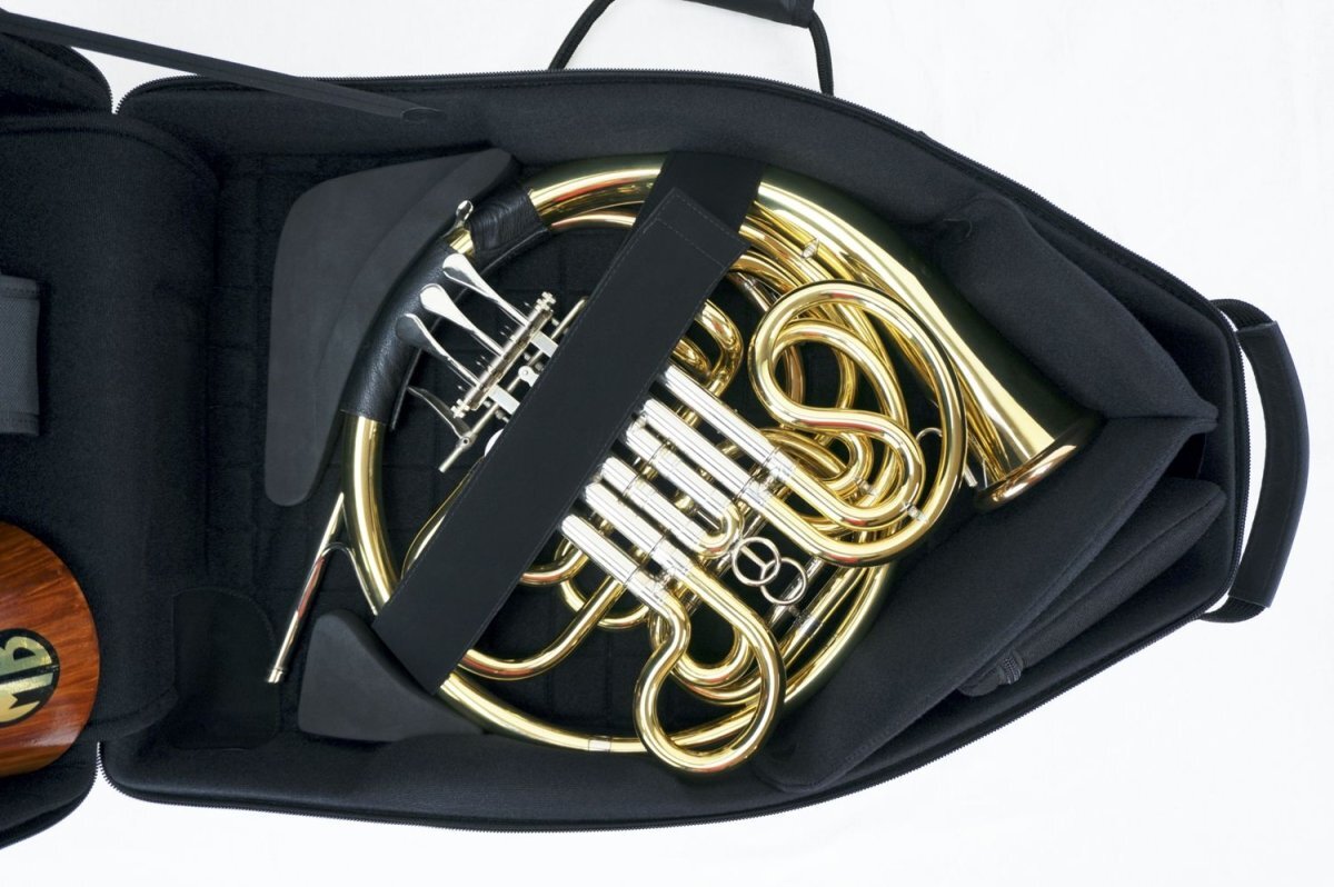 The bell is positioned on top of the French horn body, inside a foam bell protector. A velcro belt keeps the instrument's body fixed and secured. Small accessories can be stored inside the case and in the exterior pocket.
