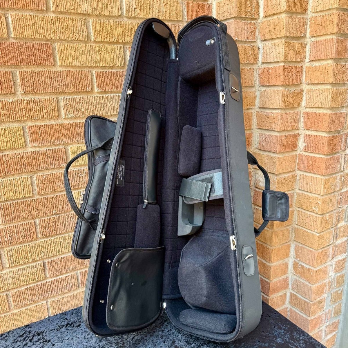 A Marcus Bonna tenor trombone case with the S.E. Shires Co. logo embroidered on the front accessories pocket. They have never been purchased but have traveled to several shows with us.