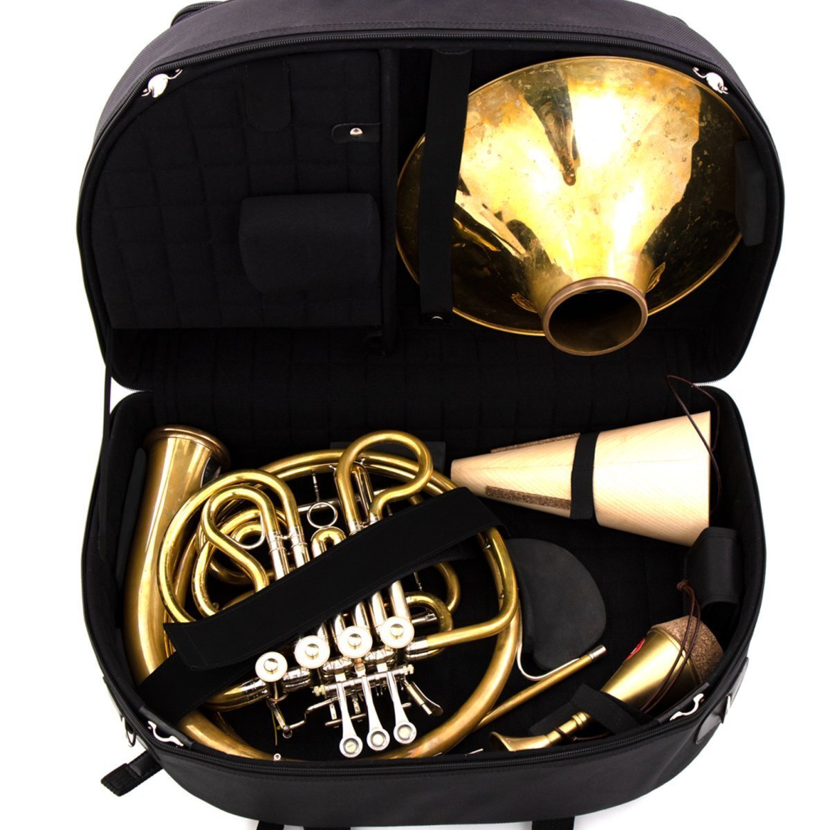 This case is incredibly roomy inside! It has straps for a straight mute and a stop mute, a bag for oils underneath the bell, and a large compartment for tuners and other accessories. Plus on the outside you can fit a sheet music and small laptop or tablet in the zippered pouch. At 22 in long, it qualifies as a carryon for most airlines, and its flat profile means it is easy to pack in a car among other luggage. A great case for a frequent traveler!