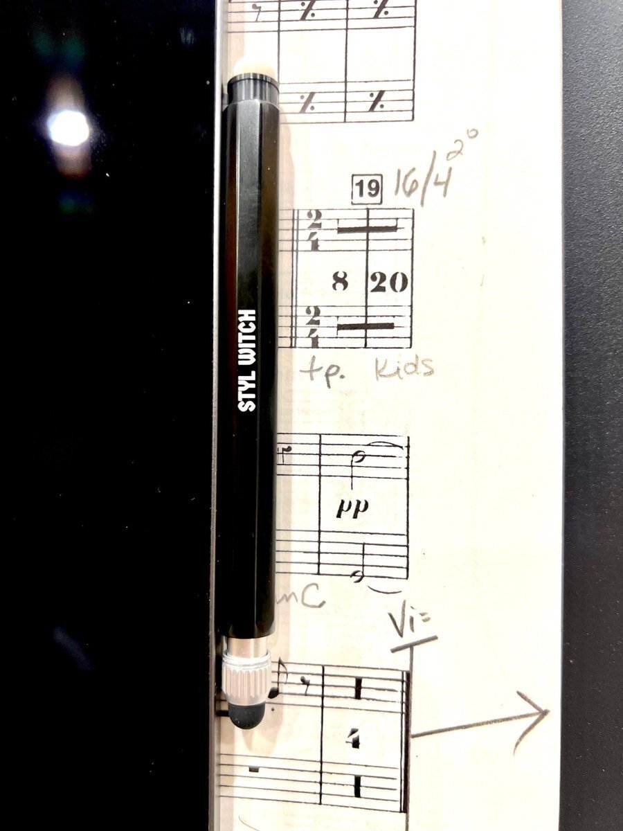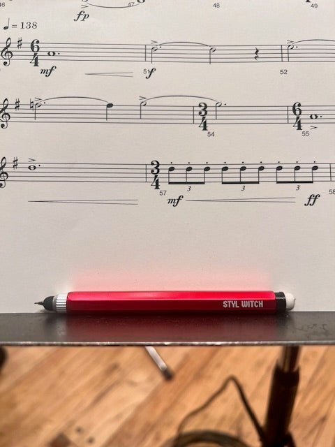 Styl Witch is an elegant and essential new writing tool that seamlessly combines a magnetized mechanical pencil with a stylus for electronic tablets. Styl Witch uses strong NeoDymium magnet inside the pencil shaft that attaches to music stands, Brass Witch products, or any magnetic surface around the office and home.