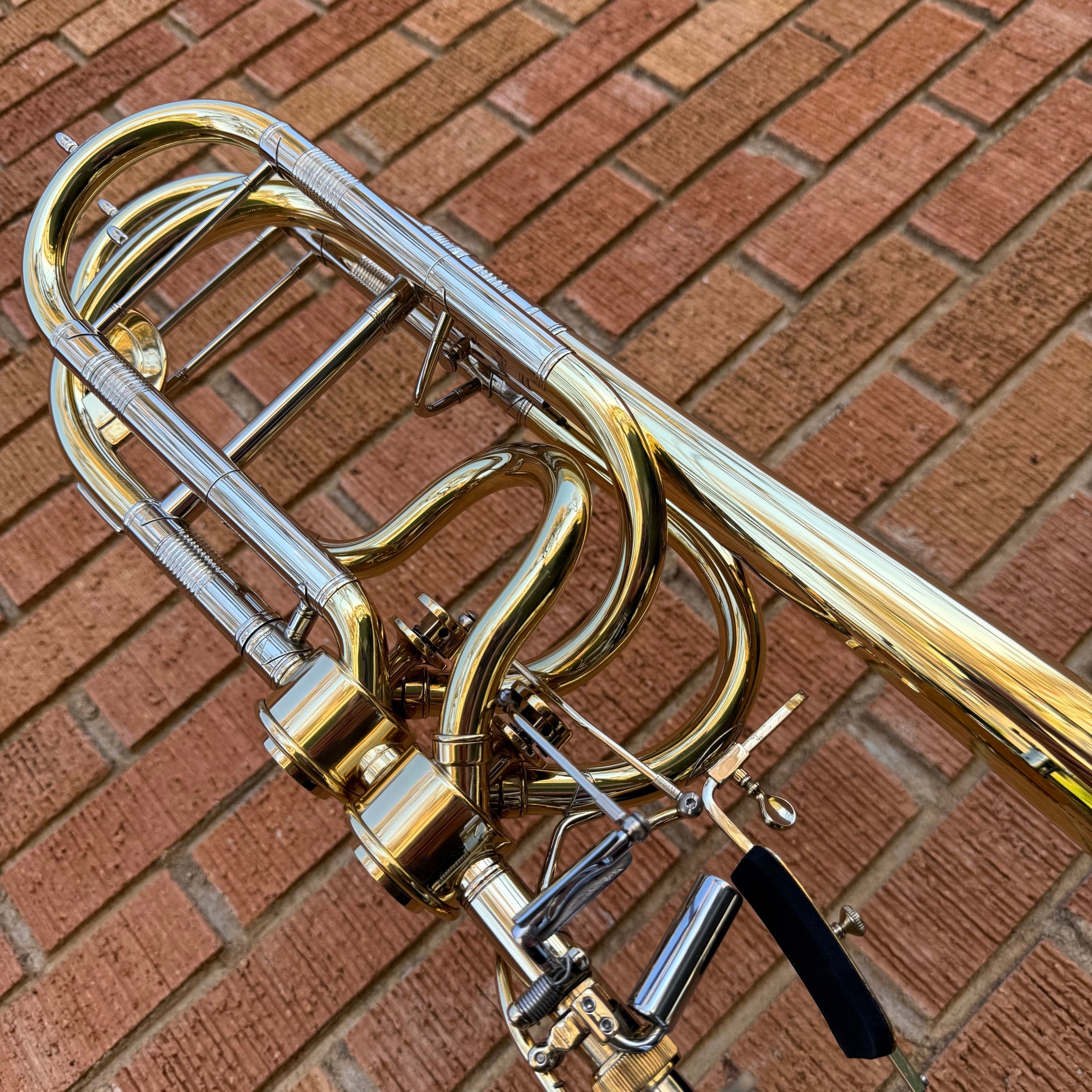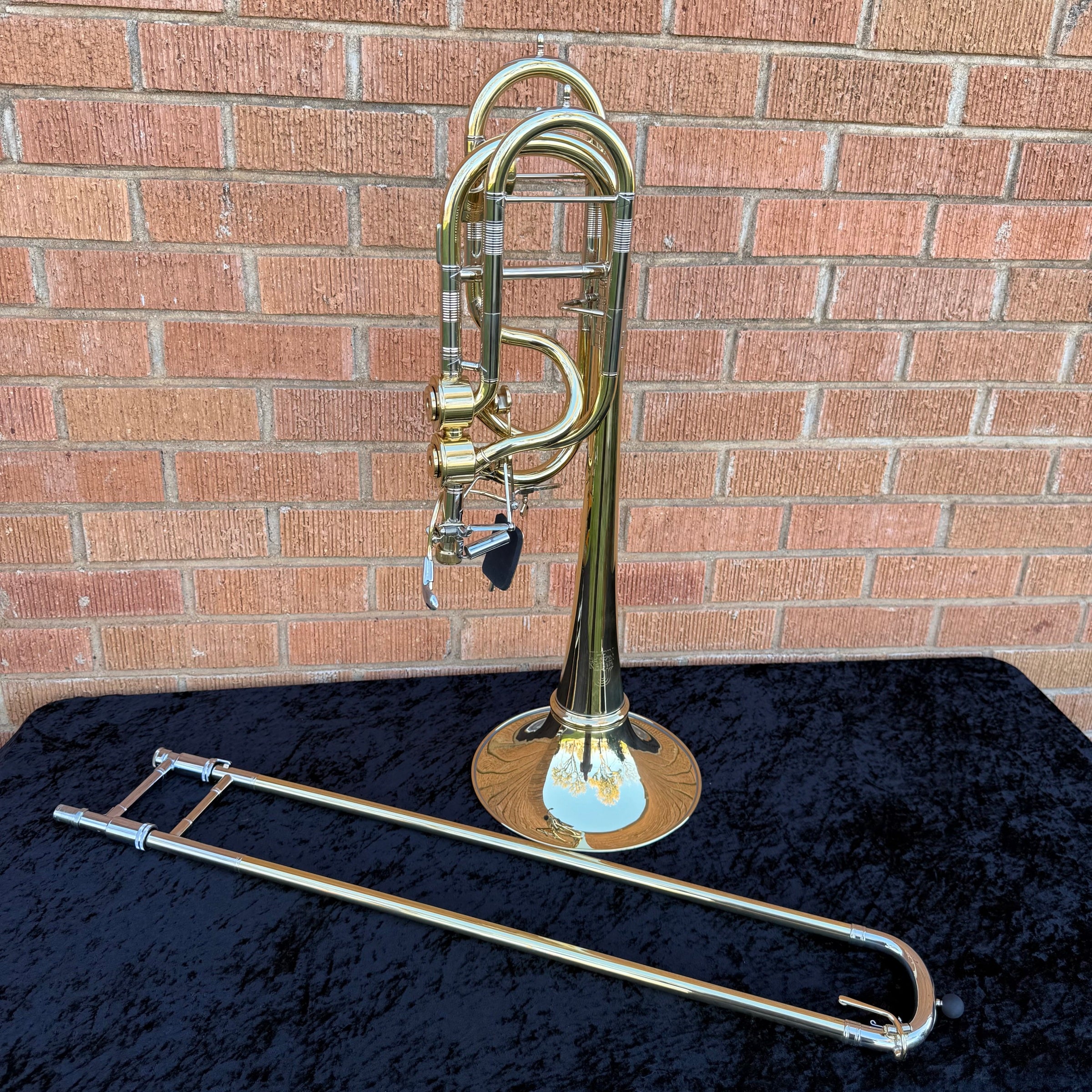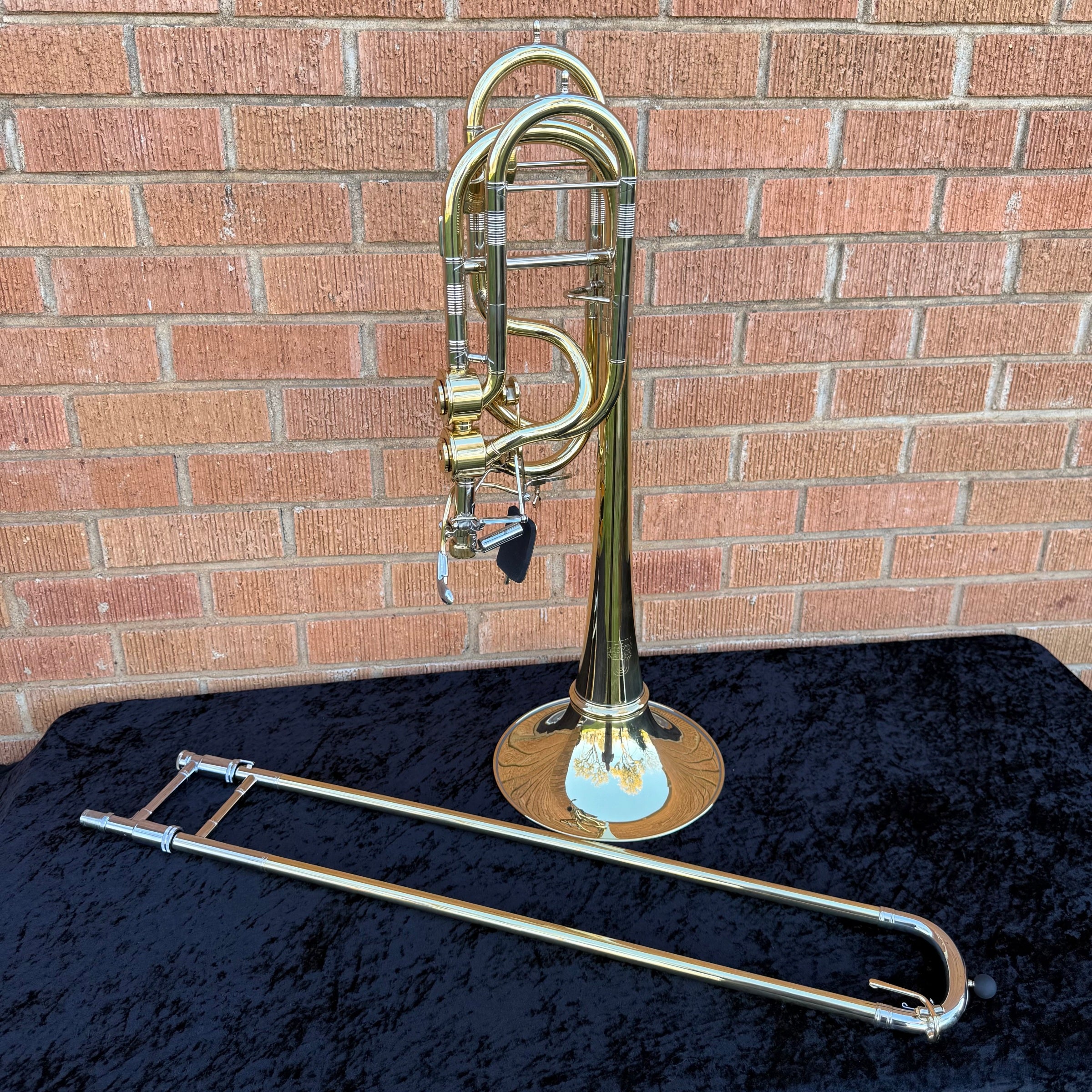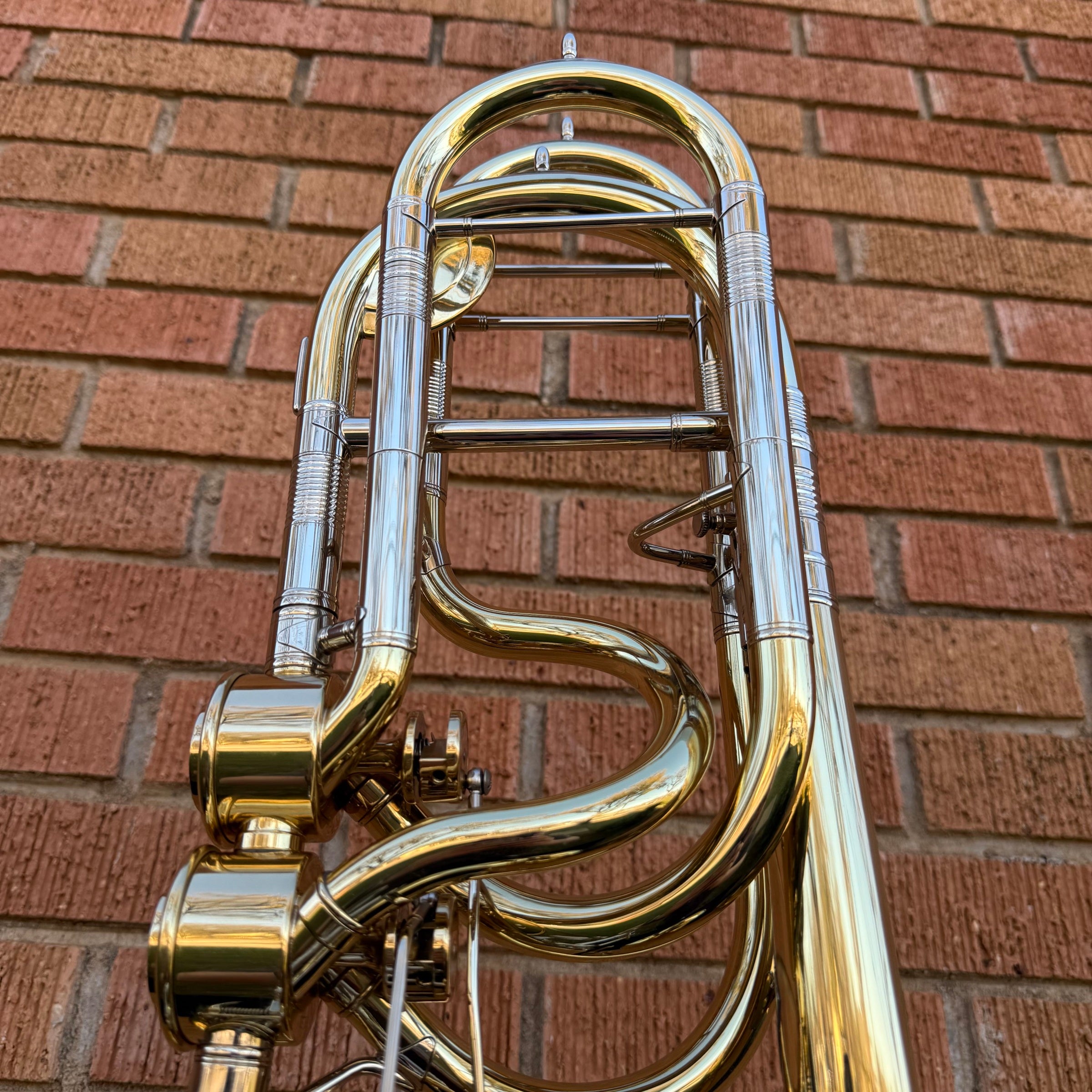The THEIN Bass Trombone “Universal” model has been continuously developed together with Zachary Bond (Hong Kong Academy for Performing Arts) since 2010. Their idea was to combine the THEIN-Sound with the easy playability of the American trombone construction. This example has minor scratches on the bell, from Thein at a show, otherwise brand-new!