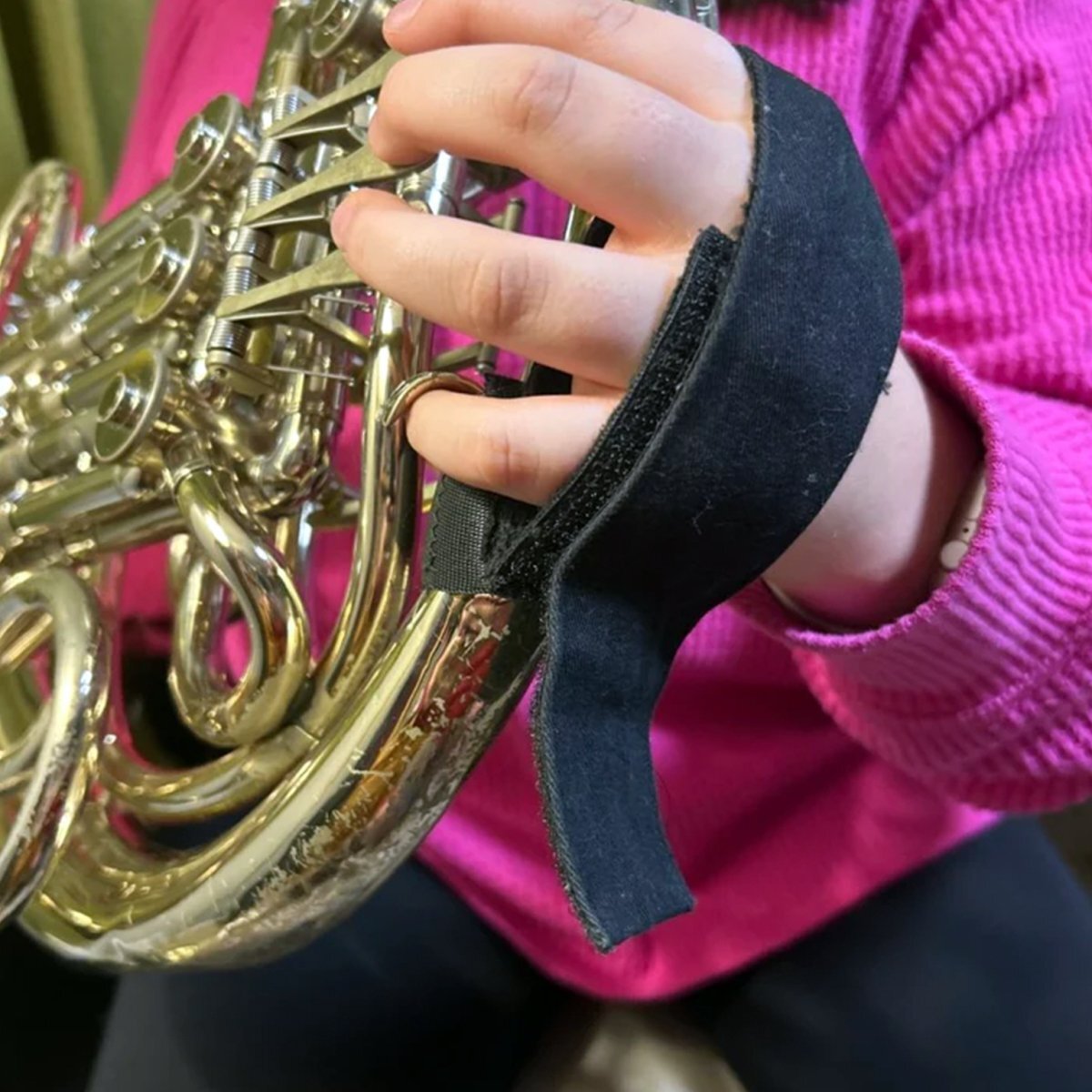 The Verus Horn Strap is designed to aid the left hand. It relieves left-hand tension, keeps the left fingers properly aligned with the valves, and reduces pinky strain while staying out of the way of the thumb. It fits every horn on the market with a pinky ring and is a great accessory for any level of horn player, especially off-the-leg players.